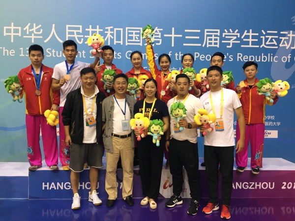 刚刚结束的杭州第十三届全国学生运动会上,我校高水平武术队代表江苏出战,共获得金牌二枚、银牌二枚、铜牌四枚,其中张丹妮独夺二金,王晶晶获得两银,每位同学都取得了前八名的成绩,团体总分81分,超额完成江苏省下达的比赛任务,上演了南农版“王者荣耀”。